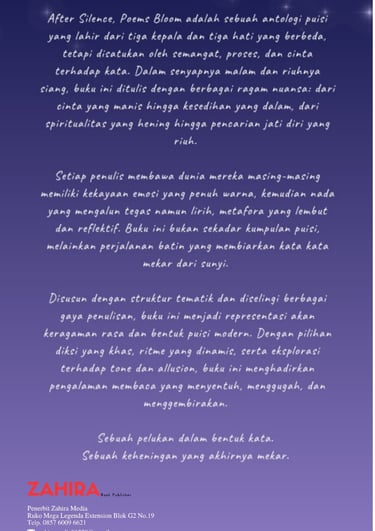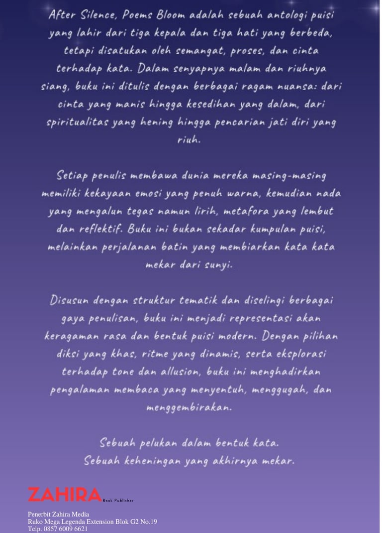 After Silence, Poems Bloom adalah sebuah antologi puisi yang lahir dari tiga kepala dan tiga hati yang berbeda, tetapi disatukan oleh semangat, proses, dan cinta terhadap kata. Dalam senyapnya malam dan riuhnya siang, buku ini ditulis dengan berbagai ragam nuansa: dari cinta yang manis hingga kesedihan yang dalam, dari spiritualitas yang hening hingga pencarian jati diri yang riuh.