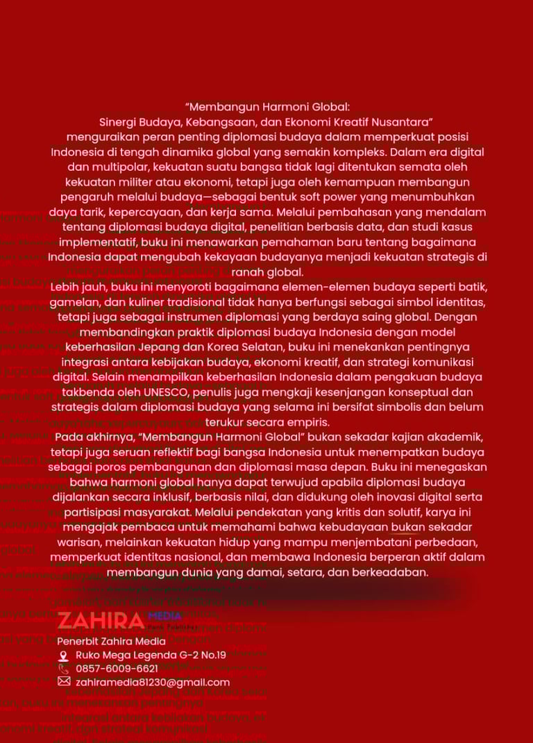Buku “Membangun Harmoni Global: Sinergi Budaya, Kebangsaan, dan Ekonomi Kreatif Nusantara” menguraikan peran penting diplomasi budaya dalam memperkuat posisi Indonesia di tengah dinamika global yang semakin kompleks. Dalam era digital dan multipolar, kekuatan suatu bangsa tidak lagi ditentukan semata oleh kekuatan militer atau ekonomi, tetapi juga oleh kemampuan membangun pengaruh melalui budaya—sebagai bentuk soft power yang menumbuhkan daya tarik, kepercayaan, dan kerja sama. Melalui pembahasan yang mendalam tentang diplomasi budaya digital, penelitian berbasis data, dan studi kasus implementatif, buku ini menawarkan pemahaman baru tentang bagaimana Indonesia dapat mengubah kekayaan budayanya menjadi kekuatan strategis di ranah global.